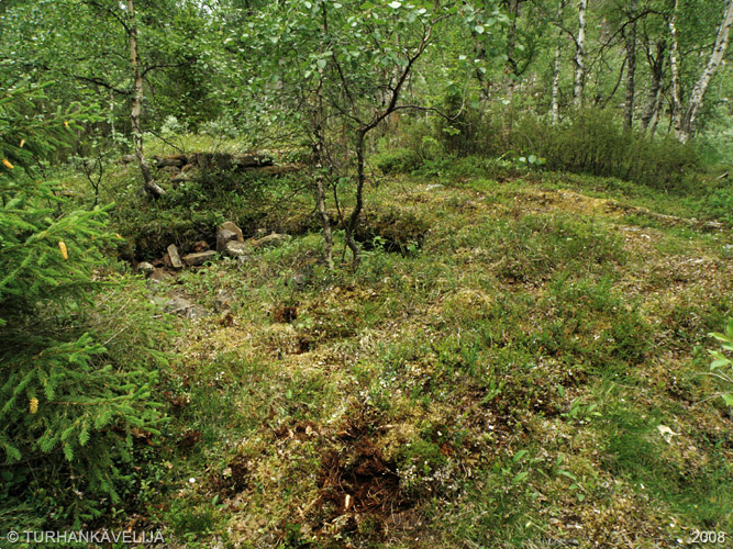Kämpän paikka vielä hyvin nähtävissä. Alimpien lahojen hirsien merkitsemät seinänpäikat näkyy
