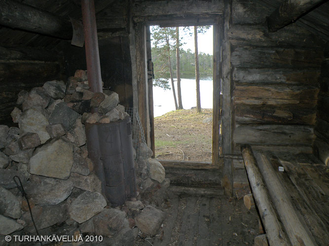 Vanhan tuvan sisätiloj. Kamiina ja sen taakse kasattu kivikasa on aika muhkeita tuvan kokoon nähden.