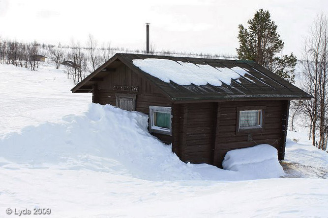 Salvasjärven rajakämpän maisemia. Taustalla näkyy viereisen autiotuvan kattoja.