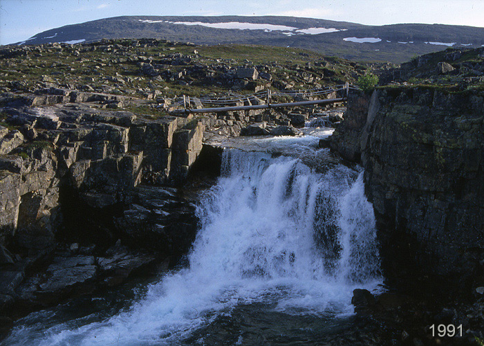 Silta ja putous Bierfejohkalla hieman Meekonjärven tuvalta.