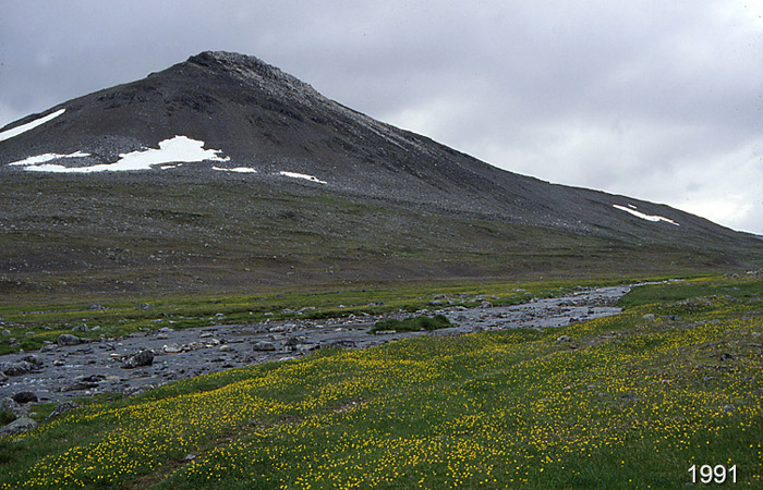 Guonjarvárrin koillisin nyppylä Kuonarjoen tuvan pihalta. Kukkaketo kulkijan iloksi.
