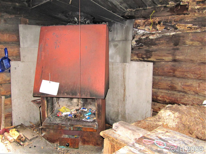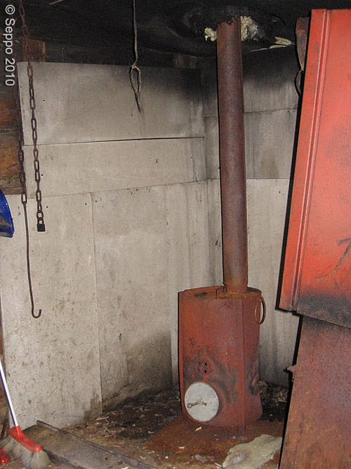Kamiinatakka. Piippu puhki. Lapussa lukee käyttökielto.