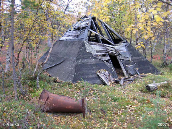 kyhäämä kämppä (no 5). Keskellä pitkittäin halkaistuista