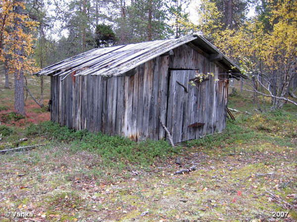pystylaudoista. Katto on myös lautaa. Ulkoseinät ovat