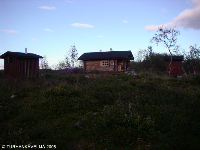 Kaskasjoen tuvan Pihapiiri iltavalaistuksessa.