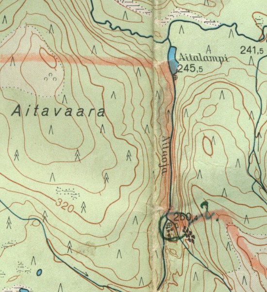 31.7.2000 "Itikoihin kyllästyneenä päätin lähteä kohti tuntureita. Suuntasin suoraan itään. Hyvää kangasmaata ja kauniita lampia vaikka leiripaikoiksi. Aitavaara helppoa maastoa. Aitaojan alapäässä oleva lampi hieman ryseikköinen rannoilta. Lämmintäkuppia ja kaakaota nautinkin sitten Aitaojan kurussa. Kaunis kuru. Tasainen vihreä pohja, harvakseltaan kuusia, ja pari metriä leveä/syvä puro luikerteli pohjalla. Itäpuolen rinne jyrkkä ja paikoin kallioinen. Kävelin länsipuolta kurun päähän. Kannatti poiketa polulta ja kulkea vaikka hieman vaikeampaakin maastoa." Kämpän etsimisestä en päiväkirjaan näemmä mitään laittanut. |