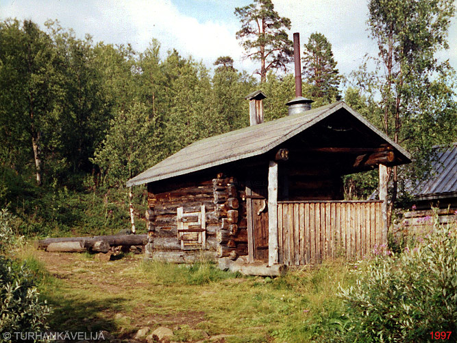Morgamojan kultalan eli Pellisen kämppän pihapiirissä oleva sauna. Paikan alkuperäisiä rakennuksia on niliaitta ja sauna.
