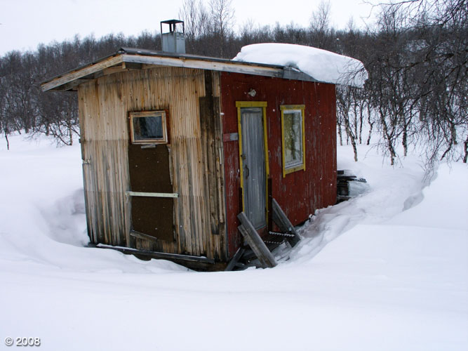 Paikalla on pieni, lukittu, yksityinen lautaparakki.