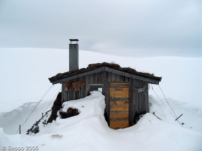 lautarakenteinen pikkuinen mökki. Harjakatto, peltinen