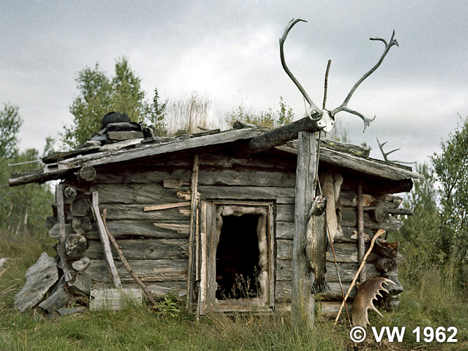 Komiat sarvet. Eikä kalansaaliskaan vaatimaton. Huomaa poronkarvakaulus oven karmeissa.