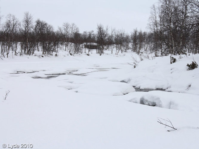 Kämppä joenmutkan koivikossa.