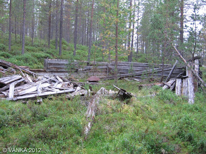 Nangujärven vankileirin polunvarren toinen kämppä. Polun varrella on useampia kämppiä ja muita rakenteita.