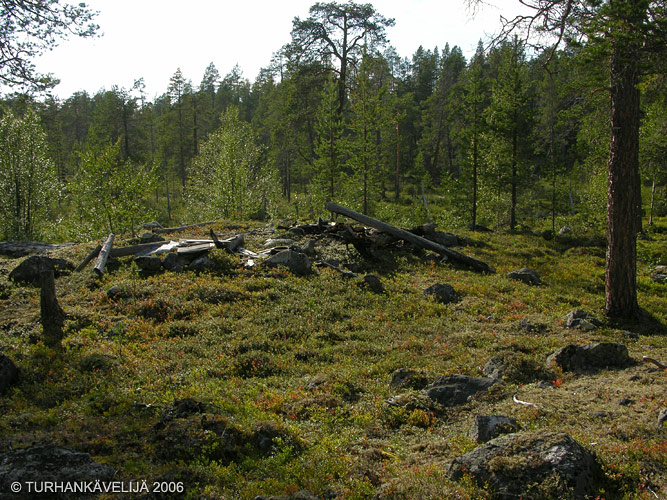 Kämppä on ollut pienellä kumpareella aivan rajan tuntumassa. Rajan poroaidan tolpat voi hahmottaa noin 50m tuvan takana.