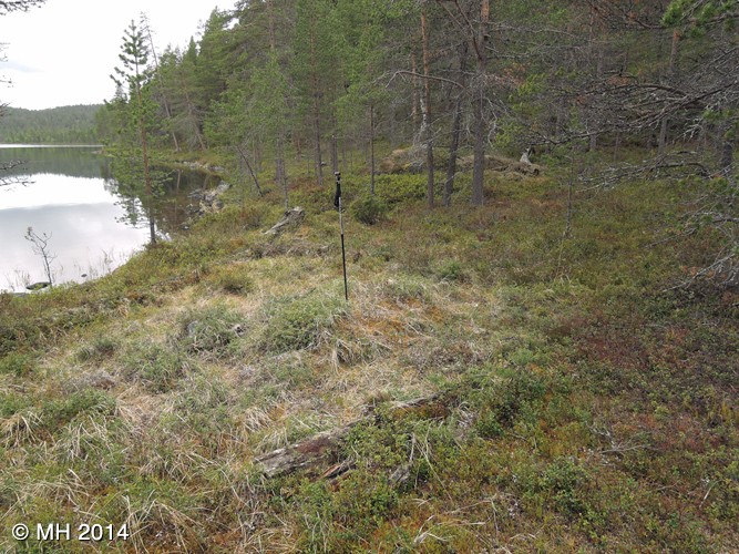 Rakennuksen paikka koillisen suunnalta. Vaellussauvan kohdalla on tulisijan kumpare.
