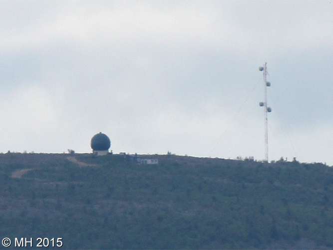 Huipun vieressä on tutkan kupoli, joitan pienempiä parakkeja ja iso antenni.